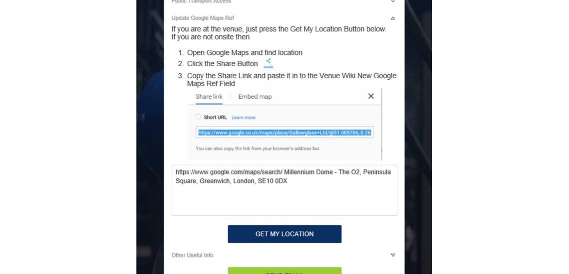To use the service, search for a venue. If we have it in our database it will appear in the search results. Please be aware that we know there are some duplicate venues. We are working on this.